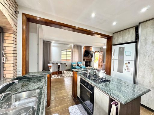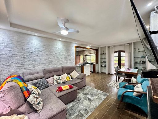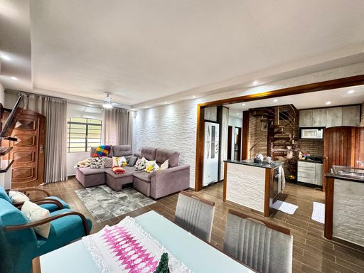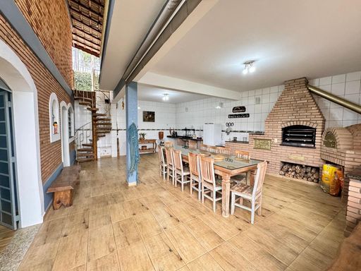 A casa com 5 quartos sendo 1 suíte todos bem amplos e um deles fica em um mezanino que pode ser um escritório, uma sala bem confortável com lareira e a sala de jantar que integra com a sala de estar e cozinha no estilo americana com armários embutidos.